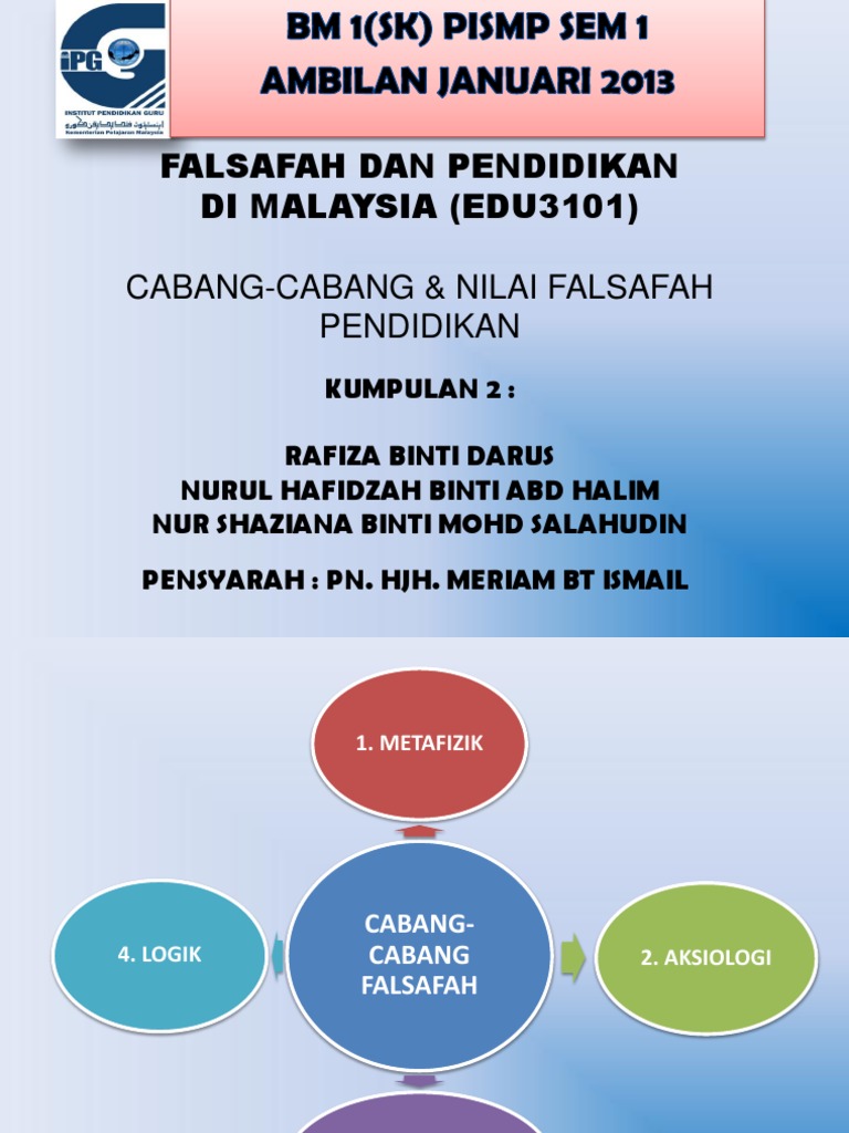 Logika merupakan cabang filsafat yang menyelidiki lurus tidaknya suatu pemikiran kita. Falsafah pendidikan kebangsaan (fpk) yang dahulunya disebut falsafah pendidikan negara (fpn), merupakan dasar pendidikan yang telah dilaksanakan di negara malaysia. Kita amat yakin fpk terus menjadi tonggak rujukan para pendidik abad 21 sebagai kerangka dalam pembangunan pendidikan kita yang pelbagai kelompok dan komuniti. Falsafah pendidikan yang menjadi panduan bagi semua aktiviti pendidikan di malaysia dikenali sebagai fpk. Falsafah dari segi estimologi bermaksud cinta kepada pengentahuan atau hikmah.
