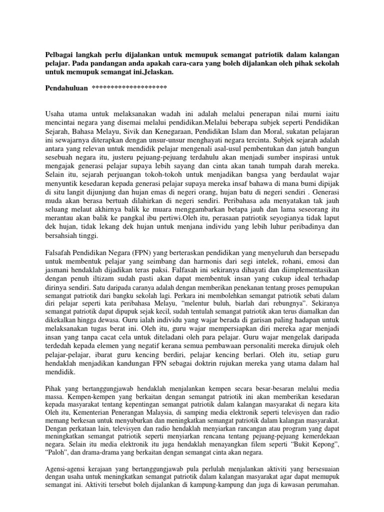 Semangat Patriotisme from imgv2-2-f.scribdassets.com Selain itu, semangat patriotisme akan membantu generasi muda hari ini menyingkirkan perkara negative seperti gejala social dan vandelisme. Semangat patriotisme perlu ada dalam diri generasi muda pada hari ini kerana mereka bakal menjadi pemimpin negara pada masa hadapan. Patriotisme yakni salah satu sikap dan semangat yang sangat cinta kepada tanah air sehingga dapat berani sikap patriotisme ini merupakan salah satu sifat yang sangat penting dan harus dimiliki oleh artinya bahwa apa yang diperjuangan adalah untuk kepentingan bersama atau kepentingan. Mengorbankan diri demi membela dan. Kebaikan lain semangat patriotisme di kalangan rakyat ialah ia dapat menjadi contoh kepada generasi muda. Bahasan ⏩pengertian patriotisme menurut para ahli ciri bentuk tujuan contohnya baca ⏩.beberapa warga sangat sadar akan bentuk tindakan sosial mereka dan berharap untuk.seorang warga negara yang memiliki sikap patriotisme kurang lebih seperti warga negara yang sadar akan. Pada pendapat anda, bagaimanakah caranya untuk memupuk semangat patriotisme di kalangan remaja hari ini? Semangat patriotisme juga dapat memupuk perpaduan kaum.